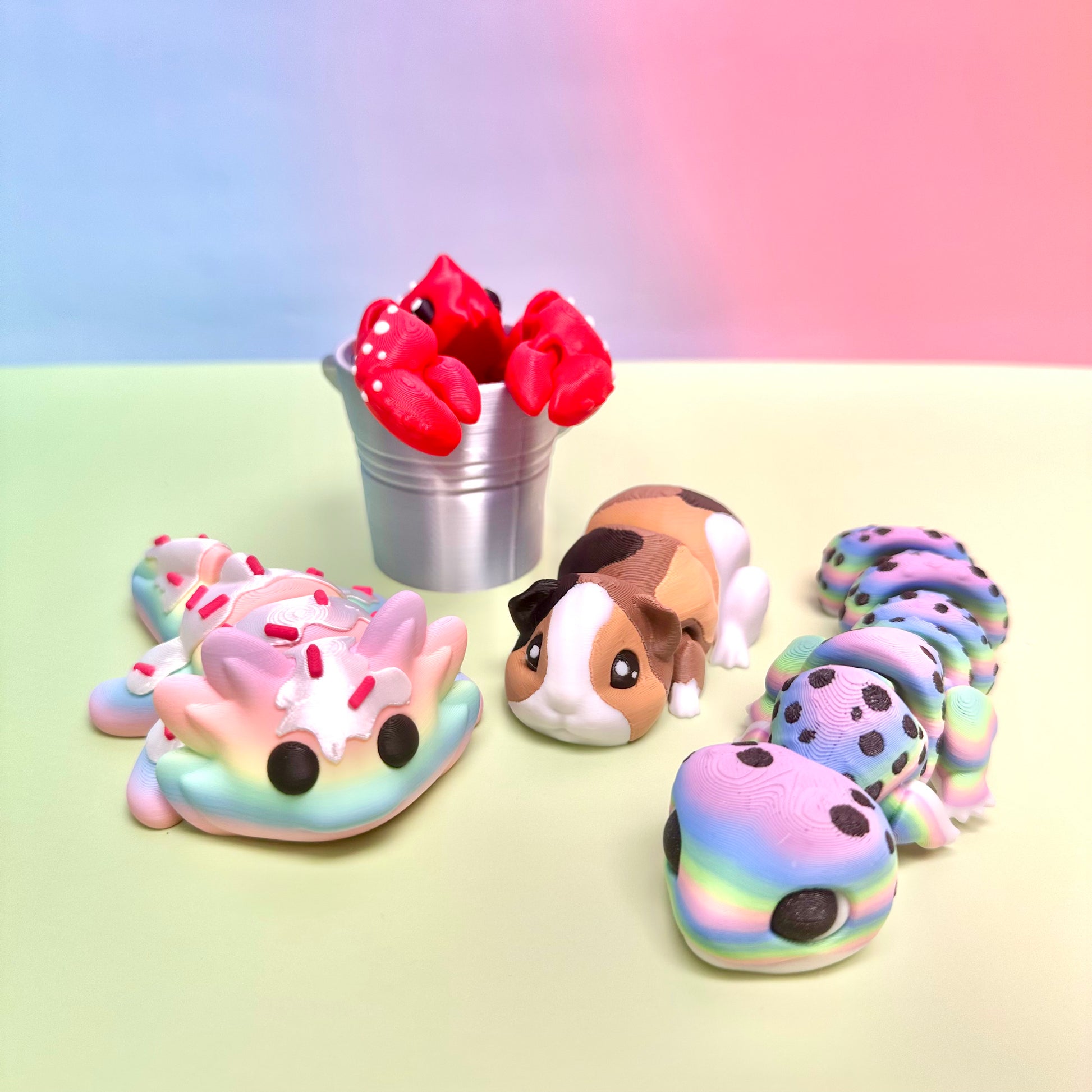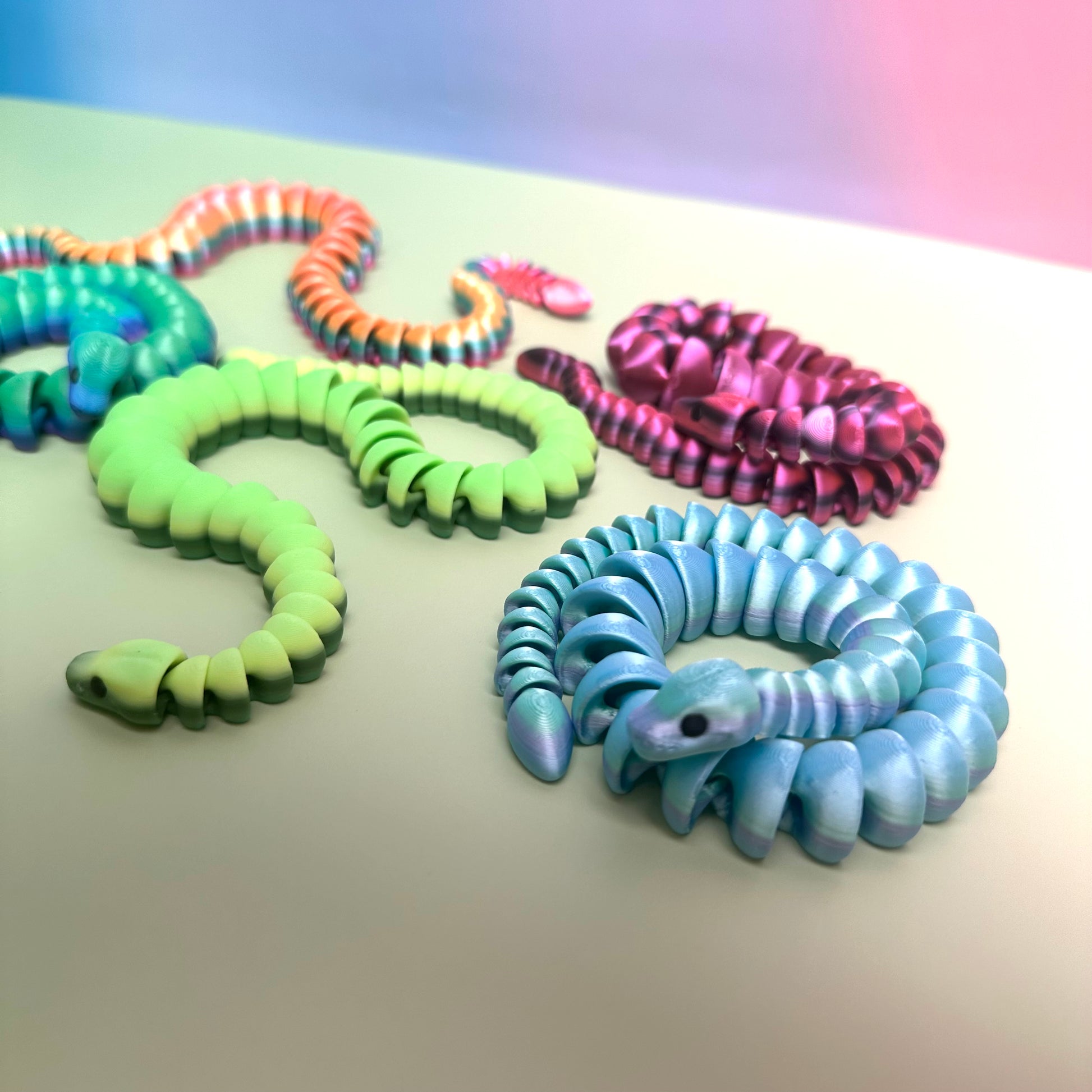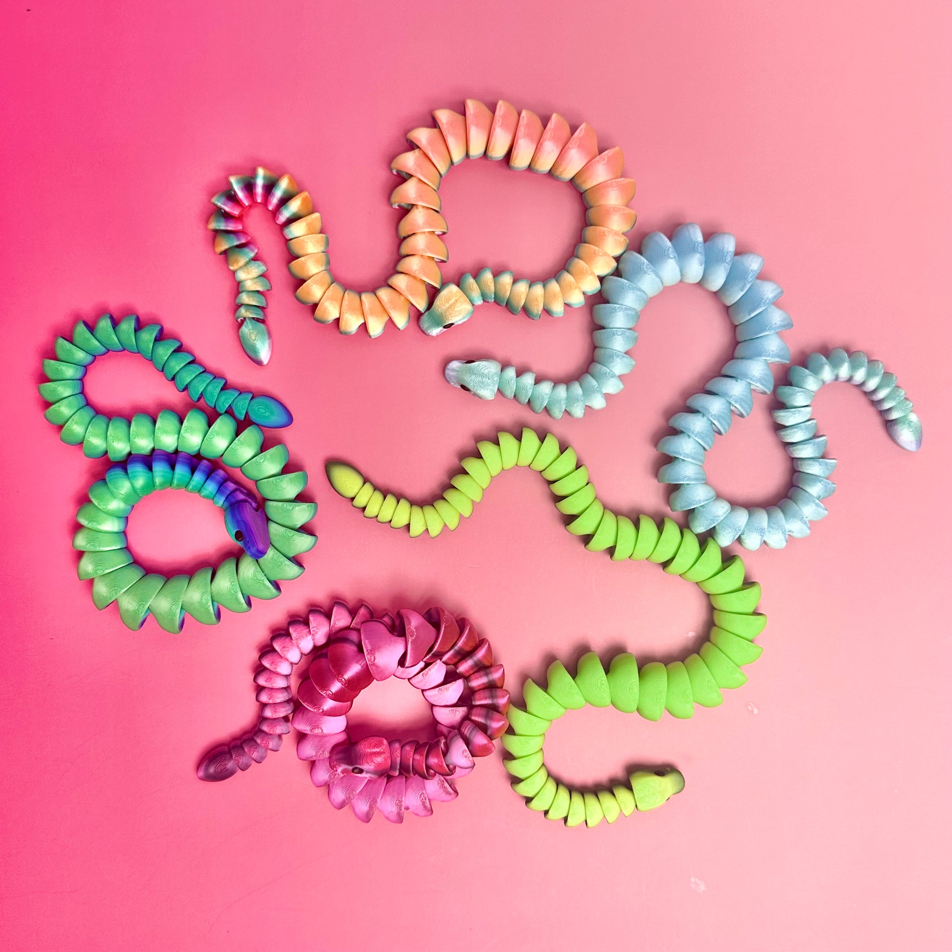 COLOR The colors as shown may vary from item to item. We often print each item in a variety of colors or use colors that have a gradient change which will make each item unique. Pictures will include all current color options that are ready to ship. If you would like a color not shown, please send us a message! Snakes have a huge variety of color, please add a comment at check out if you have a color preference (blues, greens, rainbow, pinks, etc) so we can select the perfect one for you!